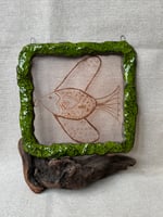 En el centro del marco descansa un pez que trae consigo la idea de movimiento, intuición y profundidad. Es un amuleto acuático, que acompaña transiciones y momentos de cambio suave, como quien se deja llevar por una corriente propia.
