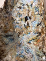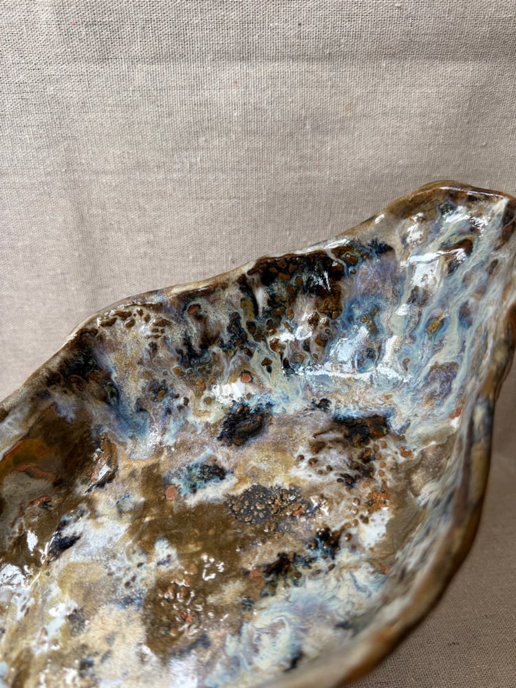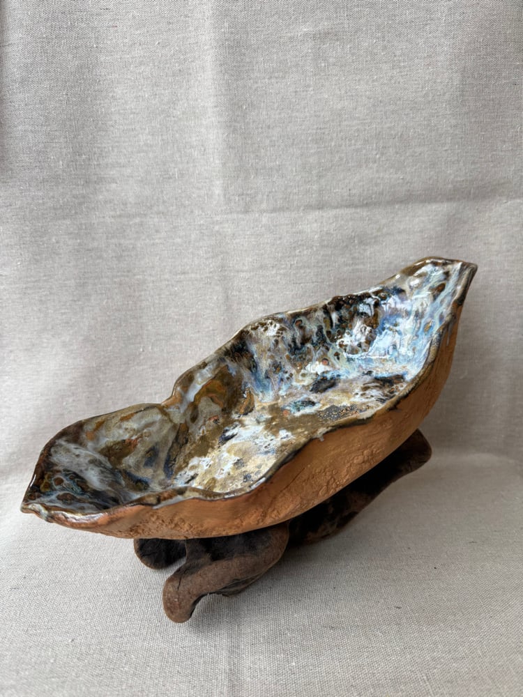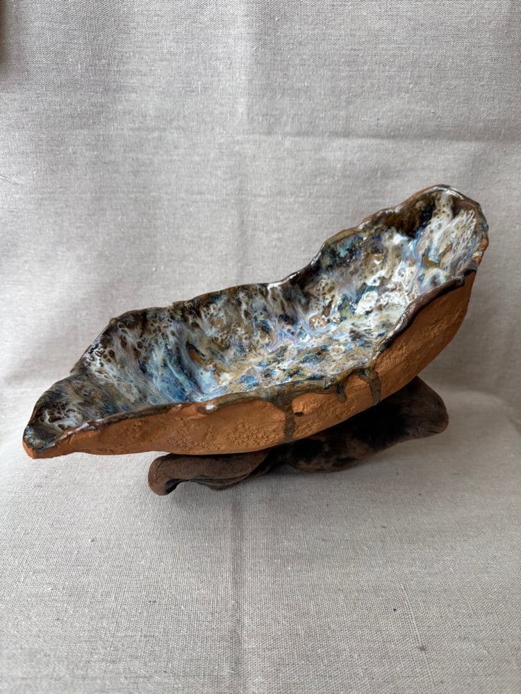 Pieza en barro refractario lila hecha y esmaltada a mano. Esmaltada y cocida a 1270 grados en horno de gas manual durante 12 horas en atmósfera reductora.