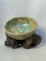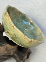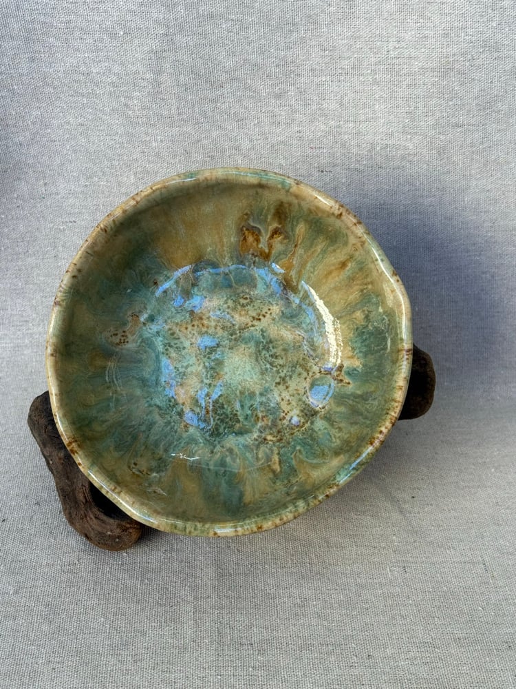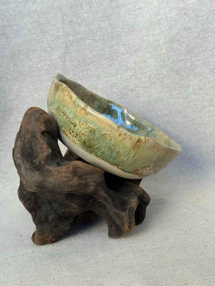 Pieza en barro refractario blanco hecha a mano. Esmaltada y cocida a 1250 grados en horno de gas manual en atmósfera reductora.