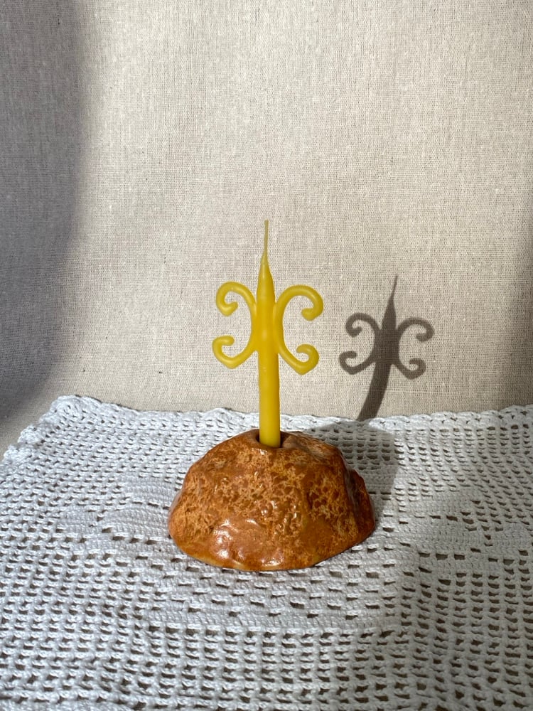 La Vela Deseo se realiza mediante un proceso lento de inmersión con cera de abeja natural, capa a capa, y después es modelada a mano. Su forma no es recta ni perfecta: se curva, se abre, se sostiene a sí misma como un gesto.