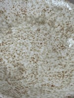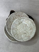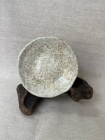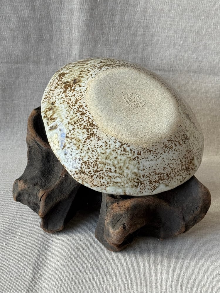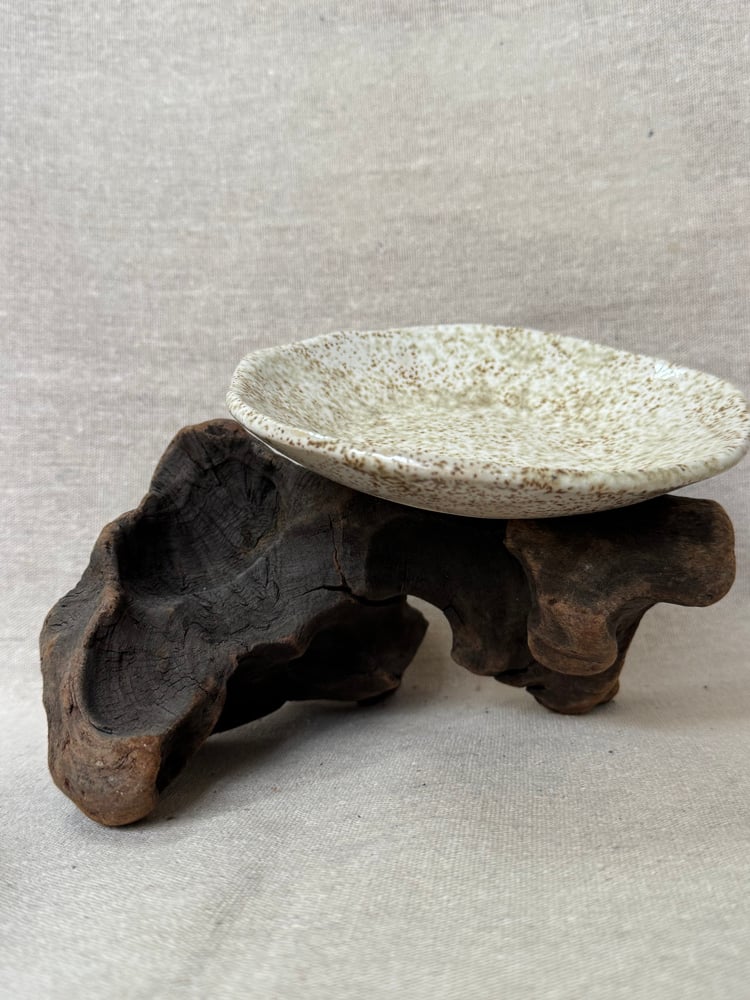 Pieza en barro refractario blanco hecha y pintada a mano. Esmaltada y cocida a 1270 grados en horno de gas manual durante 12 horas en atmósfera reductora.