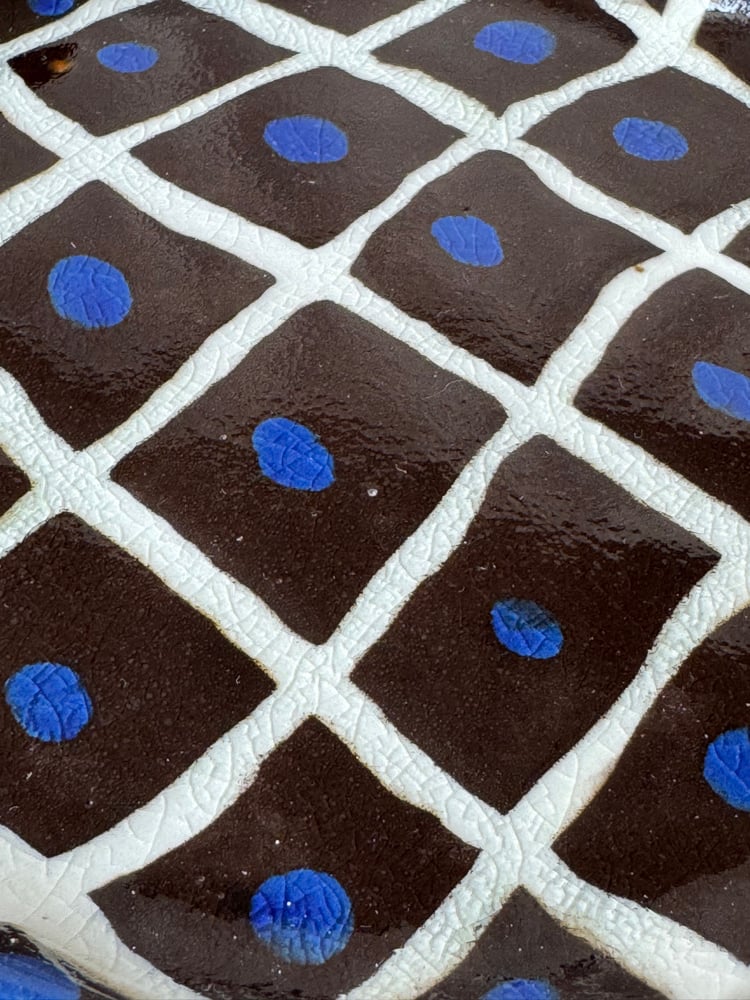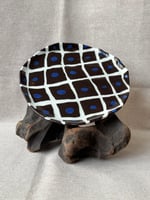 Pieza de porcelana teñida en varios colores hecha a mano empleando la técnica de nerikomi. Esmaltada y cocida a 1270 grados en horno de gas manual durante 12 horas en atmósfera reductora.